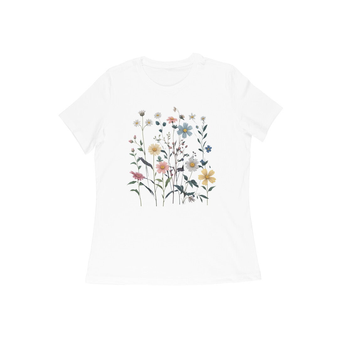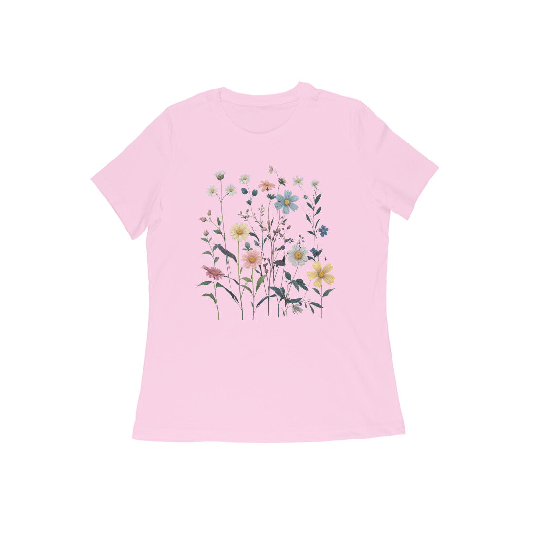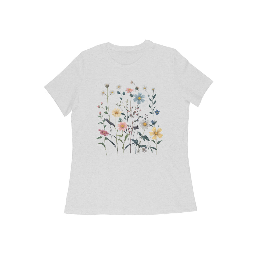 Blossoms printed crew neck half sleeve T-shirt for Women.