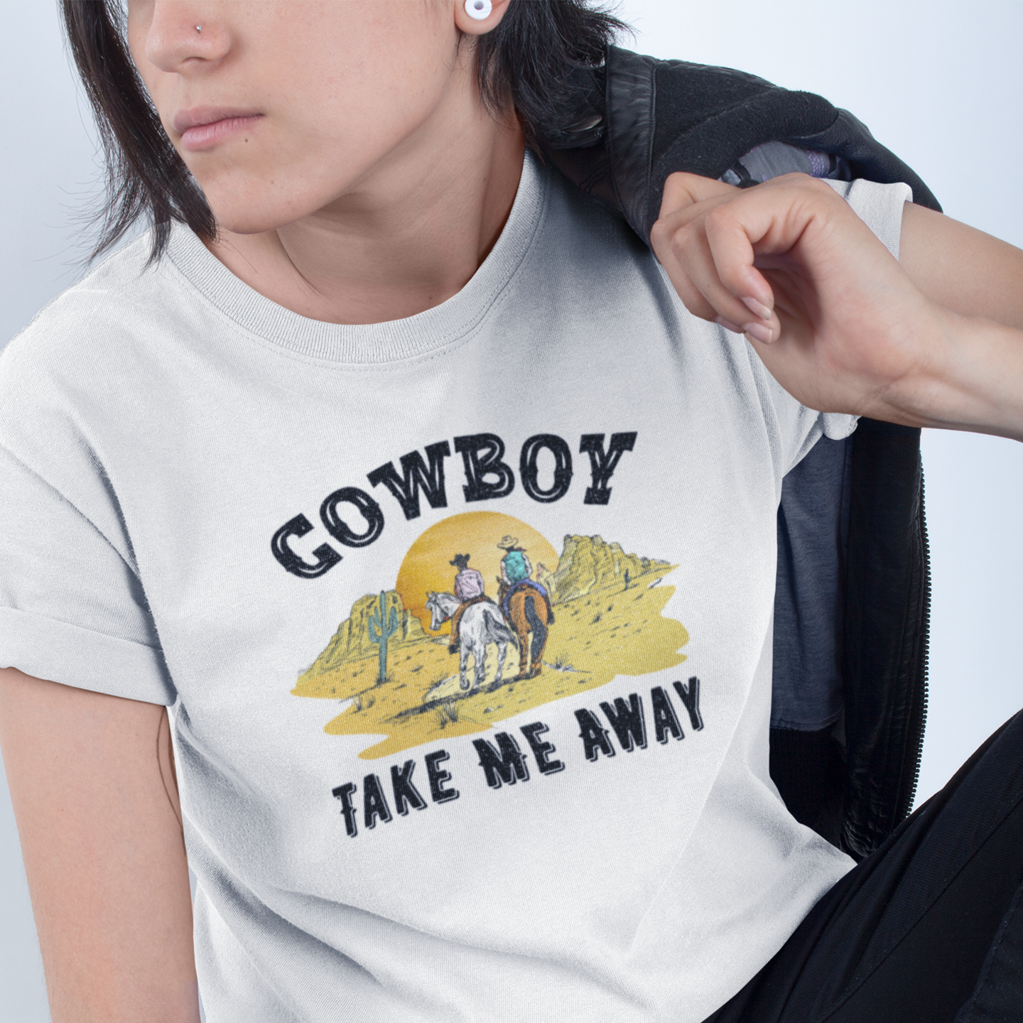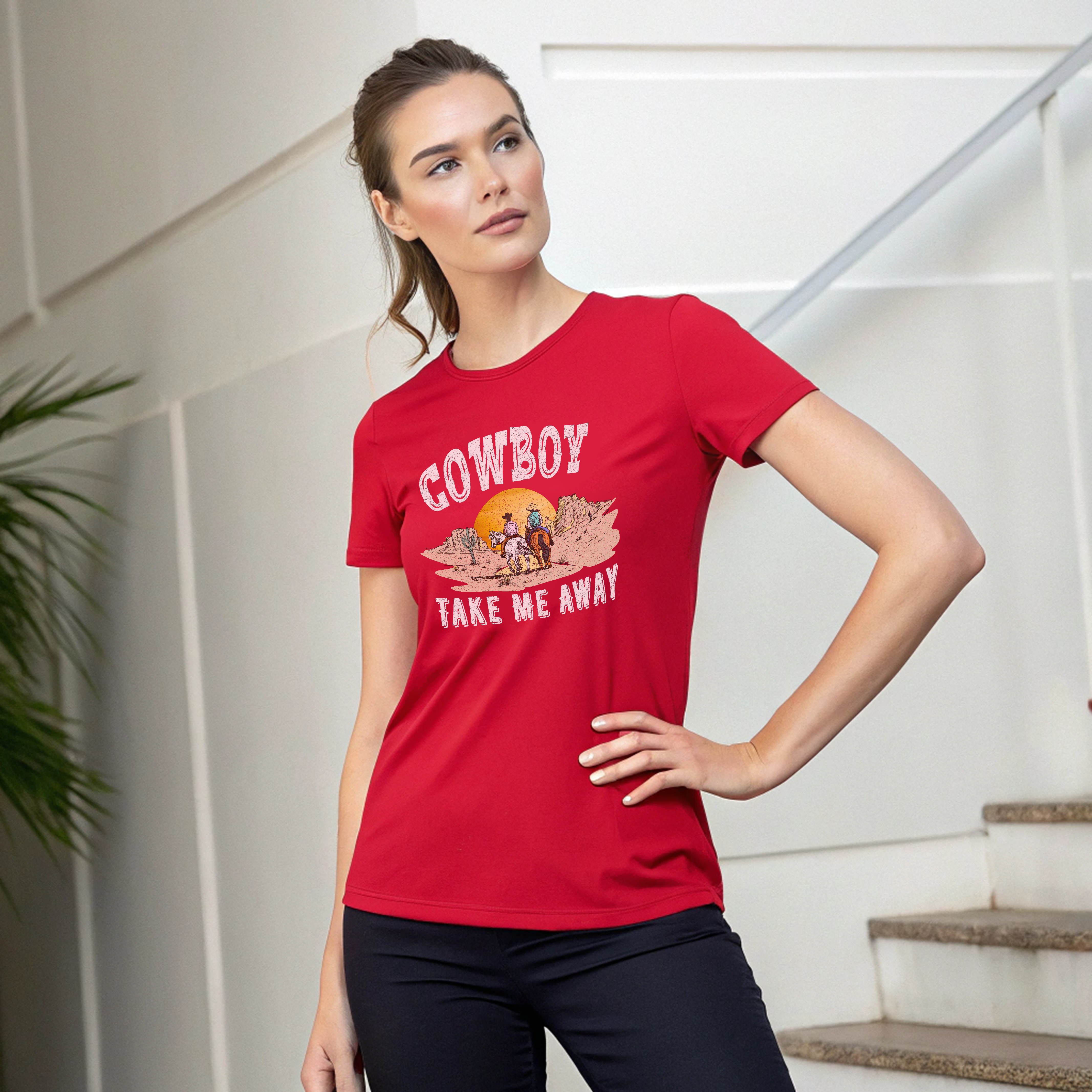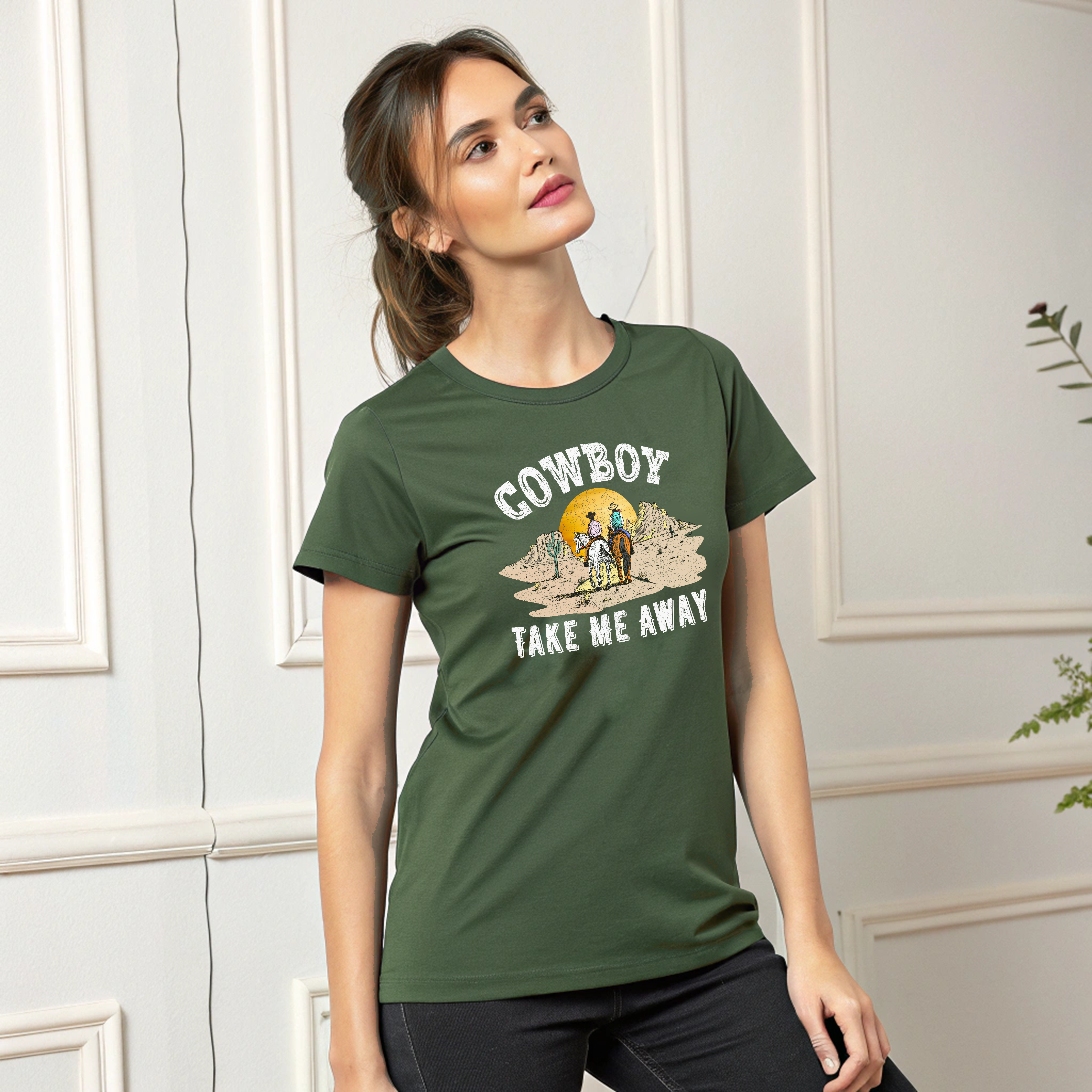 This Cowboy printed round neck t-shirt for Women features a stylish design that is perfect for any cowgirl. Made with high-quality materials, this t-shirt is both comfortable and durable. Show off your love for the wild west with this unique and eye-catching t-shirt.