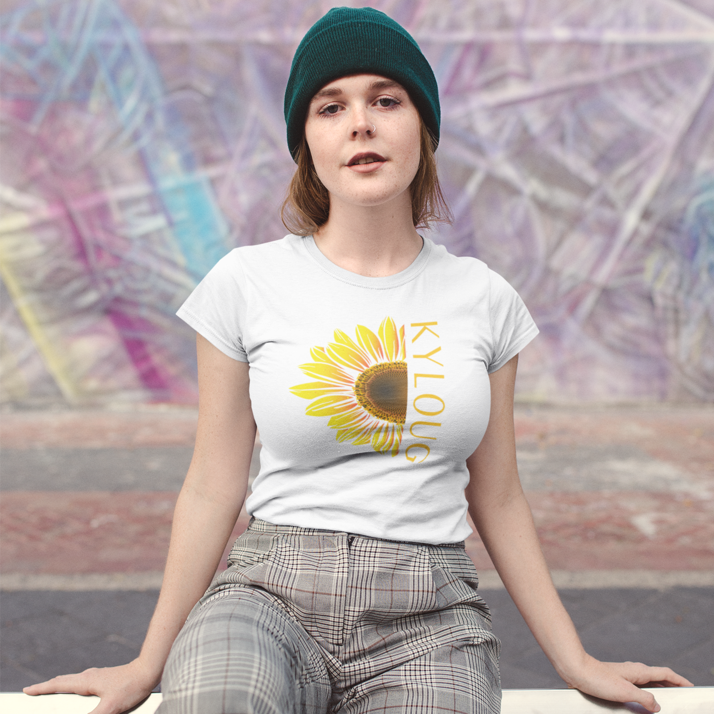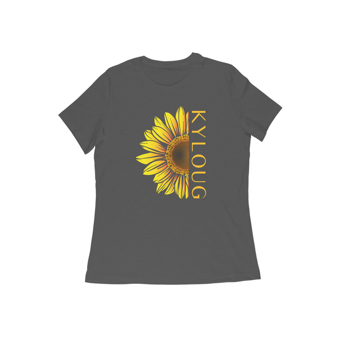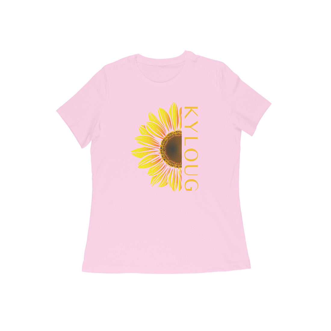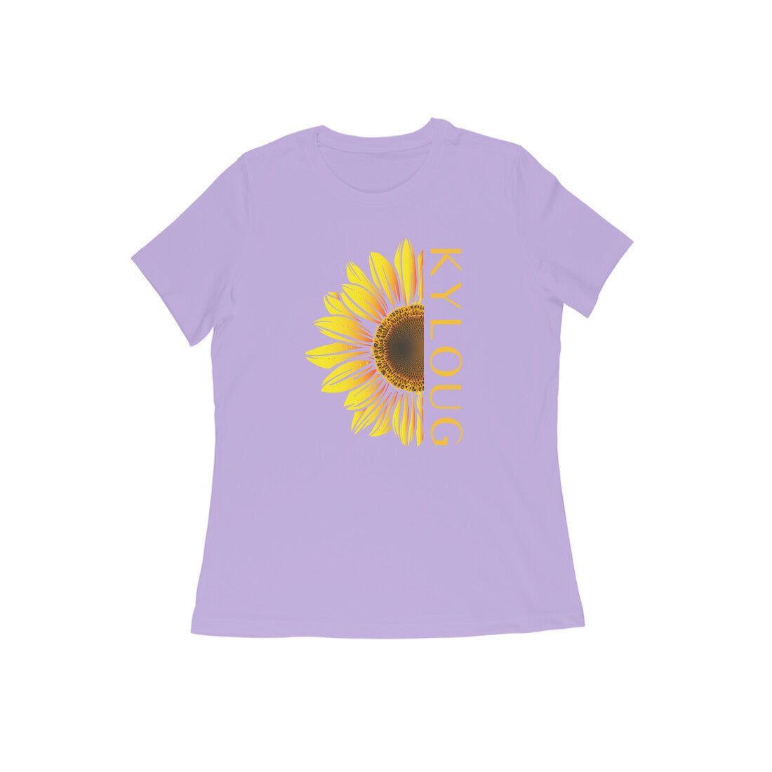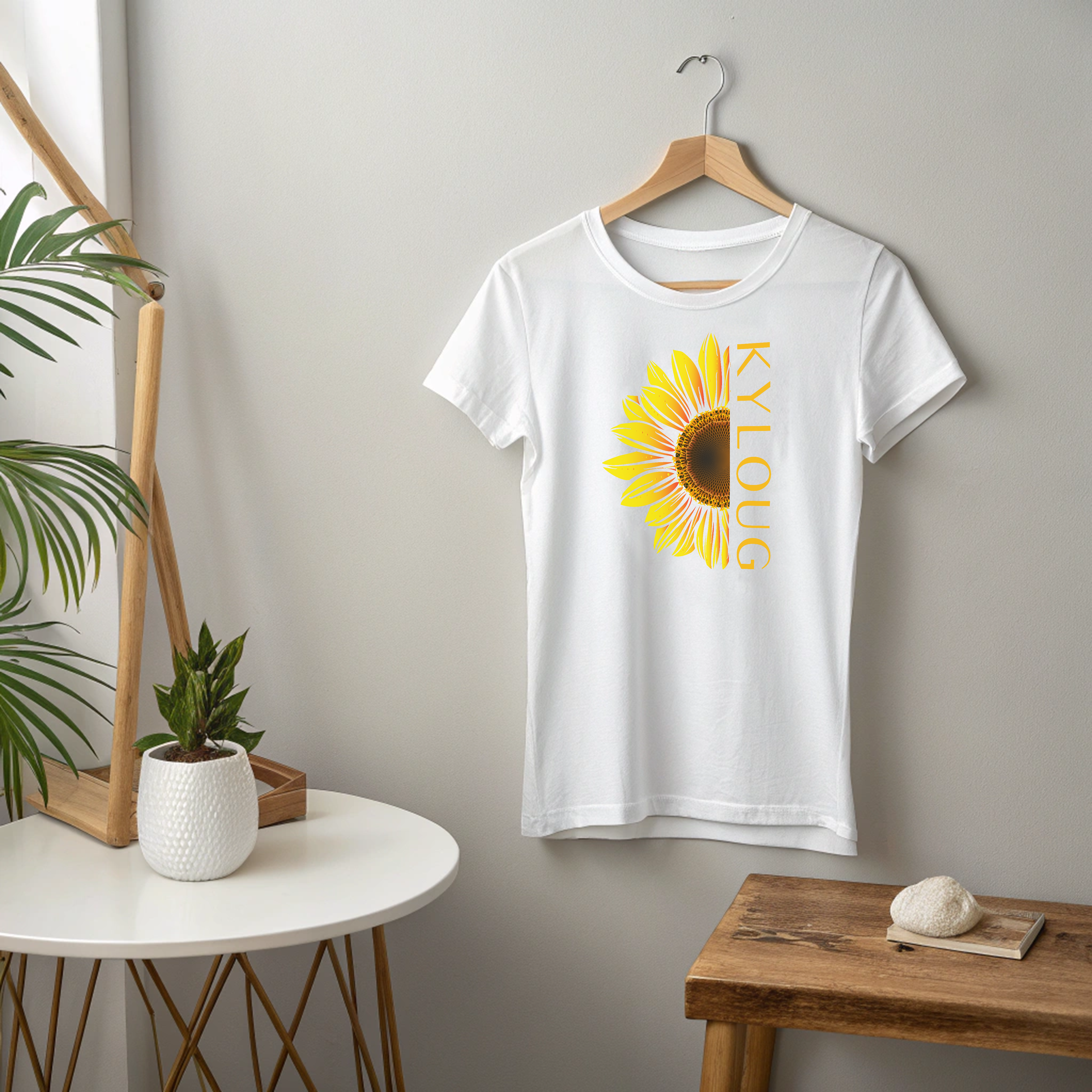 Enhance your wardrobe with our Kyloug golden sun flower printed crew neck t-shirt for Women. Made from high-quality cotton fabric, this t-shirt features a stunning sunflower print that adds a touch of elegance to any outfit. Stay stylish and comfortable with this must-have piece.