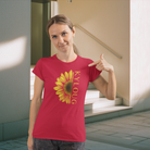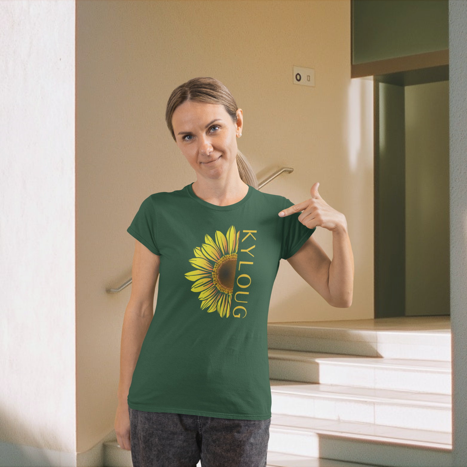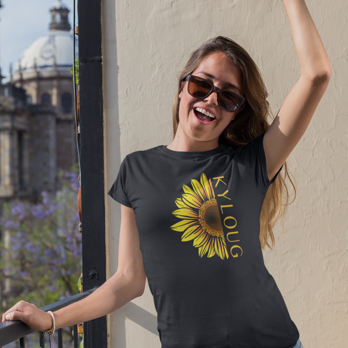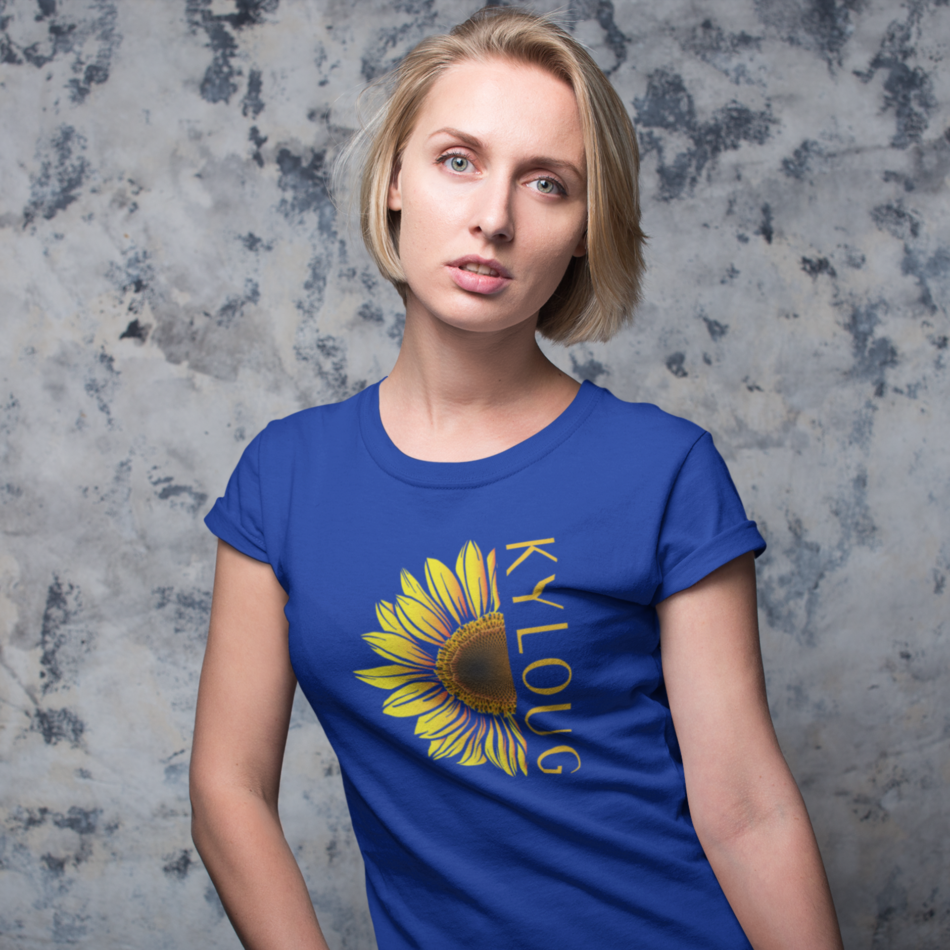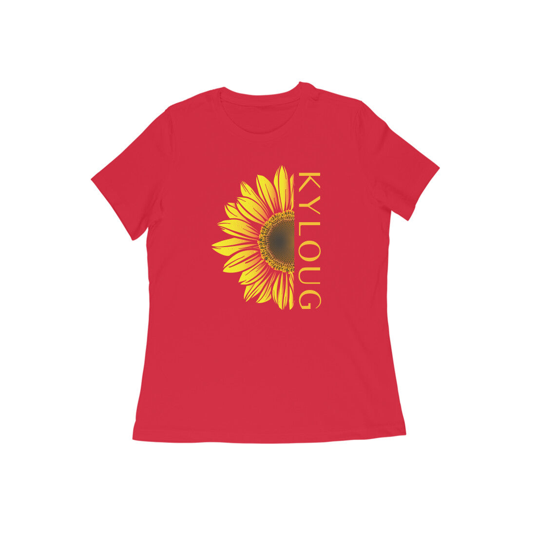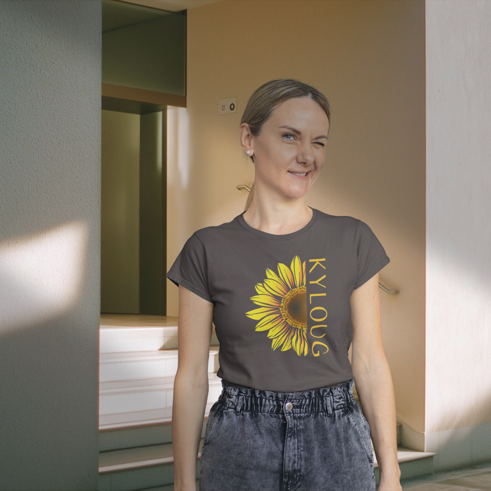 Enhance your wardrobe with our Kyloug golden sun flower printed crew neck t-shirt for Women. Made from high-quality cotton fabric, this t-shirt features a stunning sunflower print that adds a touch of elegance to any outfit. Stay stylish and comfortable with this must-have piece.