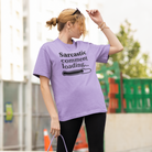 This Women's Humor Text Printed Round Neck Oversized T-Shirt combines style and comfort. Made with a round neck and oversized fit, it is perfect for daily wear. The playful text adds a touch of humor to your outfit while the high-quality material ensures long-lasting wear.